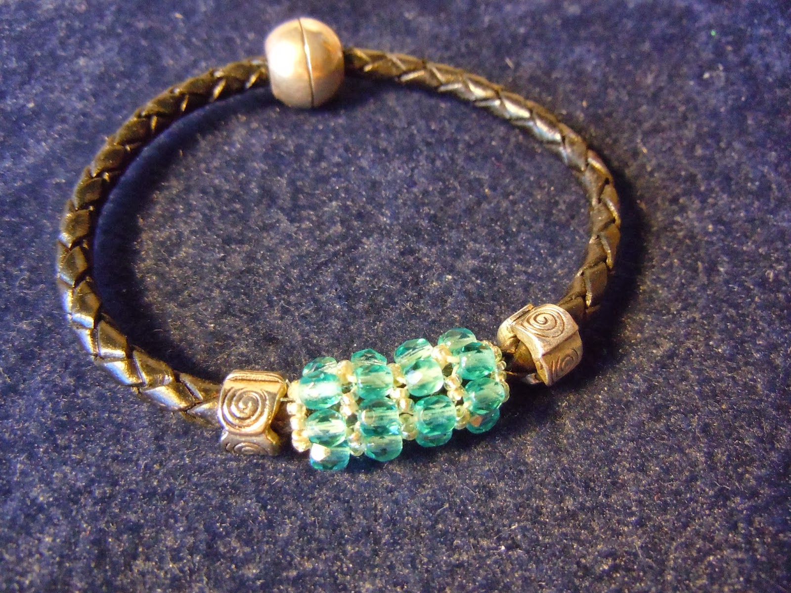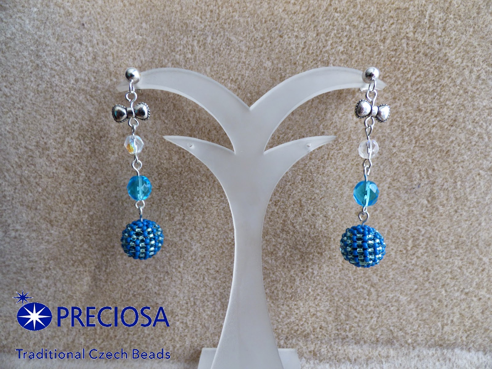 pendiente "lazo azules" creado con: piezas facetadas de cristal y bola forrada con rocalla de 11 en dos colores en tecnita peyote de la marca Preciosa Ornela.